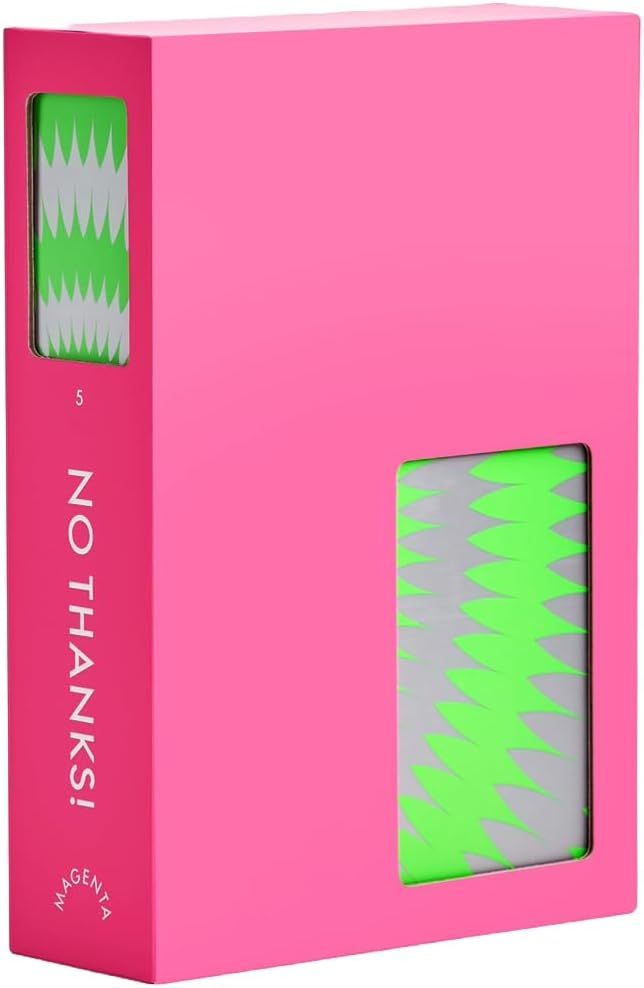 No Thanks! is a card game designed to be as simple as it is engaging. The rules are simple. Each turn, players have two options: play one of their chips to avoid picking up the current face-up card pick up the face-up card (along with any chips that have already been played on that card) and turn over the next card However, the choices aren't so easy as players compete to have the lowest score at the end of the game. The deck of cards is numbered from 3 to 35, with each card counting for a number of points equal to its face value. Runs of two or more cards only count as the lowest value in the run - but nine cards are removed from the deck before starting, so be careful looking for connectors. Each chip is worth -1 point, but they can be even more valuable by allowing you to avoid drawing that unwanted card. The first versions of the game supported up to five players, but the German 2011 edition supports up to seven (simply by increasing the number of chips). This game was originally published in Germany in 2004 by Amigo as Geschenkt ...ist noch zu teuer!, meaning Even given as a gift, it is still too expensive!. Amigo's 2006 international edition, titled No Merci! (a delightful multi-lingual pun), had rules in several languages, including English. The game has subsequently been released in other countries under an assortment of names. The German 2024 edition includes additional cards to allow for play with variant rules.