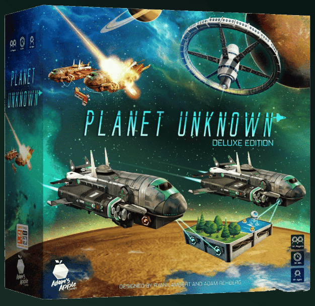 Our planet has run out of resources, and we are forced to move. We have discovered a series of planets and sent our rovers to test their environment with the hope of colonization. Our rovers have confirmed 1-6 viable colonization options. Planet Unknown is a competitive game for 1-6 players in which players attempt to develop the best planet. Each round, each player places one polyomino-shaped, dual-resource tile on their planet. Each resource represents the infrastructure needed to support life on the planet. Every tile placement is important to cover your planet efficiently and also to build up your planet's engine. After placing the tile, players do two actions associated with the two infrastructure types on the tile. Some tile placements trigger "meteors" that make all planets harder to develop and prevent them from scoring points in the meteor's row and column. Planet Unknown innovates on the popular polyomino trend by allowing simultaneous, yet strategic turn-based play via the Lazy S.U.S.A.N. space station in the center of the table. —description from the publisher