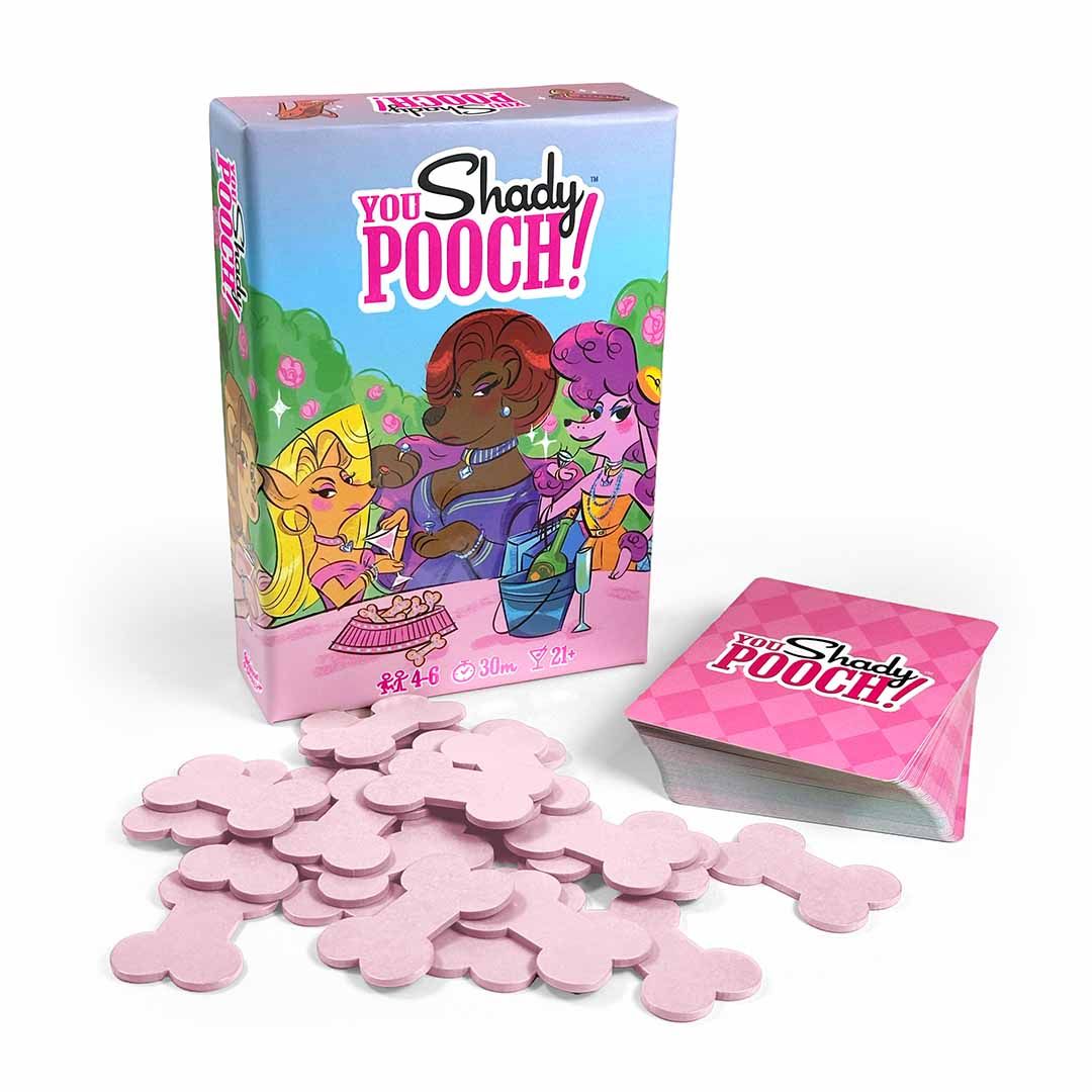 Get ready for this rapid fire card game where posh pooches behave badly. The grande dames of canine high society have gathered for a deliciously vicious martini lunch- and they’re trading barbs between sips. Can you throw shade quick enough to be the top dog? You Shady Pooch! is played over several rounds. You'll start with 4 bones that you'll wager each round. The first player to empty their hand wins that round's pot. Once someone's lost all of their bones, the game ends, and the richest pooch wins! Every copy of You Shady Pooch! features 54 fabulously illustrated cards by artist Joshua Heinsz, an instruction booklet, drinking game variant rules, and 24 delightful wooden bone tokens to help the shady pooches at your game table keep score. —description from the publisher