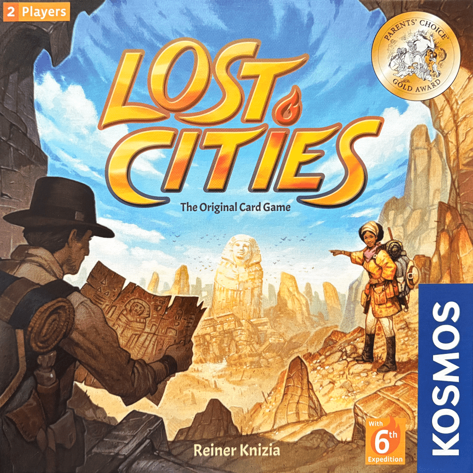 Lost Cities is a card game in the Kosmos two-player series. The game originally consisted of a single deck of cards of rank 2–10 in five different colors with three special "handshakes" ("HS" in scoring examples below) in each suit, but as of 2018 the game now includes six colored suits, with the sixth color being optional for gameplay. A game board is included to organize discarded cards and help players organize their card collections. The object of the game is to gain points by mounting profitable archaeological expeditions to the different sites represented by the colored suits of cards. On a player's turn, they must first play one card, either to an expedition or by discarding it to the color-appropriate discard pile, then draw one card, either from the deck or from the top of a discard pile. Cards played to expeditions must be in ascending order, but they need not be consecutive. Handshakes are considered lower than a 2 and represent investments in an expedition. Thus, if you play a red 4, you may play any other red card higher than a 4 on a future turn but may no longer play a handshake, the 2, or the 3. The game continues in this fashion with players alternating turns until the final card is taken from the deck. The rest of the cards in hand are then discarded and players score their expeditions. Each expedition that has at least one card played into it must be scored. Cards played into an expedition are worth their rank in points, and handshakes count as a multiplier against your final total; one handshake doubles an expedition's value, while two handshakes triples that value and three handshakes quadruple it. Expeditions start at a value of -20, so you must play at least 20 points of cards into an expedition in order to make a profit. If you are left with a negative value and have a handshake, the multiplier still applies. A 20-point bonus is awarded to every expedition with at least eight cards played into it. A complete game of Lost Cities lasts three matches, with scores for each match being added together. Scoring example 1: An expedition has a 2,3,7,8,10 for a total of 30. This expedition is worth 10 total points: 30 plus the initial -20. Scoring example 2: An expedition has 2 HS, and 4,5,6,7,8,10 for a total of 40. This expedition is worth 80 total points: 40 points for cards, plus the initial -20, ×3 for the two multipliers, plus the 20-pt bonus for playing 8+ cards. Scoring example 3: An expedition has 1 HS, and 4,6,7 for a total of 17. This expedition is worth -6 total points: 17 plus the initial -20, ×2 for the multiplier.